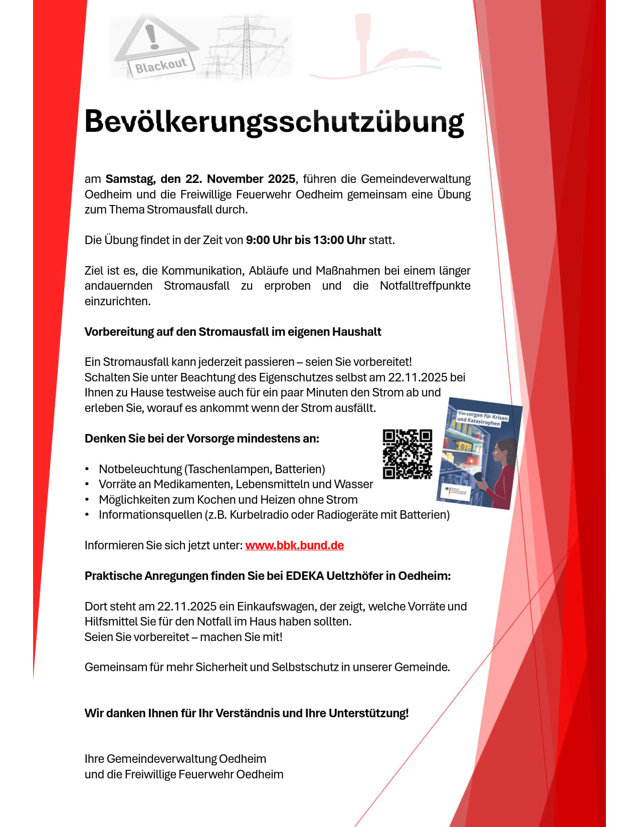 Es werden einzelne Szenarien in kleinen Fachgruppen der Feuerwehr, der Gemeindeverwaltung und auf Stabsebenen regelmäßig fiktiv durchgespielt und Notfallpläne ausgearbeitet bzw. getestet. Großangelegte Übungen finden in unregelmäßigen Abständen in verschiedenen Orten im Landkreis statt. Am 22.11.2025 plant die Gemeindeverwaltung Oedheim zusammen mit der Feuerwehr eine größere Bevölkerungsschutzübung in Oedheim und Degmarn. Bei dieser Übung wird in den öffentlichen Gebäude (Rathaus, Schulzentrum, Feuerwehr, Sport- und Turnhallen) der Strom abgestellt. Da die zuvor genannten Gebäude auch gleichzeitig Teile der Notfalltreffpunkte sind, werden diese am Übungstag mit Notstrom eingespeist. Das öffentliche Stromnetz für Geschäfte und Privathaushalte wird nicht abgestellt. Für die Bevölkerung besteht kein Handlungsbedarf. Schwerpunkt und Ziel der Übung wird die Kommunikation zwischen den Notfalltreffpunkten, der Feuerwehr und der Gemeindeverwaltung sein.